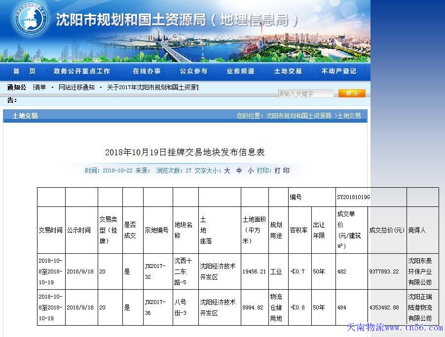 據(jù)沈陽市規(guī)劃和國土資源局10月22日公告,于今年10月8日至10月19日掛牌交易的沈西十二東路-5地塊、八號(hào)街-3地塊已成交,競(jìng)得人分別為沈陽東泰環(huán)保產(chǎn)業(yè)有限公司、沈陽物流正瑞陸港物流有限公司,總面積約28.45萬平,規(guī)劃用途分別為工業(yè)用地、物流倉儲(chǔ)用地。
